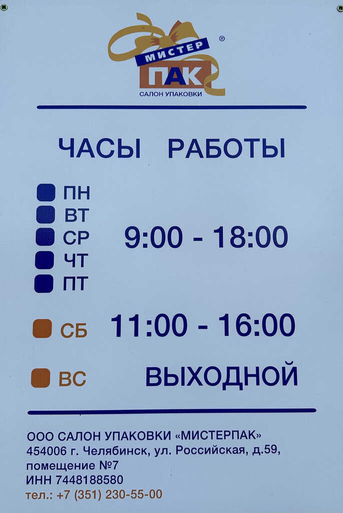 Склад - магазин « Салон упаковки МистерПак» предлагает ассортимент упаковочных материалов и одноразовой посуды по самым выгодным ценам . В наличии выбор ассортимента из 2500 наименований товара . Три свободных парковки для ваших автомобилей . Адрес : Российская , д , 59 . Телефон +7 (351) 230-55-00 , 230-45-00.