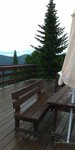 Очень красивый вид, когда поднимаешься в гору. Вокруг кедры с шишками, ели, березы ... Птицы, которые раньше мне не встречались. И вот пересадка. Очень хорошо, что есть кафе, в котором можно выпить чашечку кофе, перекусить. Кафе и снаружи и внутри приятное, в современном стиле. Обслуживание бытрое. С открытой площадки возле кафе прекрасные виды на горы.