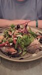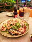 It is not on the first line, actually this is the advantages, namely: quiet, there is no crowd, there are always places and, most importantly, the kitchen. The portions are just huge, you can eat one salad, salads are just a miracle, I've never eaten such, and not only salads, meat, vegetables, and everything else. The prices are not expensive. We always had dinner on the terrace, because children's birthday parties were held in the hall every day. The feed is fast enough (respect to George). In general, we were there every evening until the vacation ended.