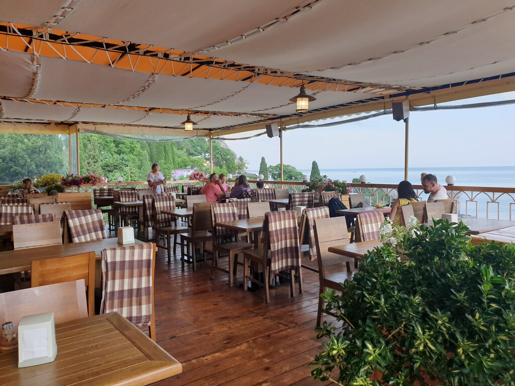 Ну мы, конечно, не ожидали)) порции большие и вкусные! Борщ подаётся с пампушкамии тремя соусницами - перетертое с зеленью хорошо посоленное сало, домашняя(!!) сметана и ялтинский лук, борщ классный, и уха отличная, лаваш с сыром и зеленью вообще неожиданно вкусный - казалось бы, всего лишь лаваш, но они укладывают тончайшее тесто в несколько слоев с сыром и зеленью 💚 цветная капуста у них интересно готовится в яйце, пеленгас и скумбрия барбекю - супер вкусные, фреши - честно фреши))) молочные коктейли с шоколадом и с бананом отличные; на след день попробовали рапаны в сливочном соусе - просто эпично 🙀😻 мидии с овощами - нежнейшие, шикарные, опять заказали борщ и уху - дада, настолько вкусно, что брали два дня подряд ☝🏻 а лимонад домашний они делают на основе фреша - поям с мякотью, мы выбрали апельсиновый и он классный) лаваш тоже на второй день был всё такой же вкусный; помимо роскошного вида нас развлекали ещё и чайки) наша официантка вчера даже помогла подняться и улететь чайке, случайно сорвавшейся с перил на пол между столами)) респект за бережное отношение к птицами! Официанты оба дня нам попадались хорошие, надеюсь, они тут все такие)