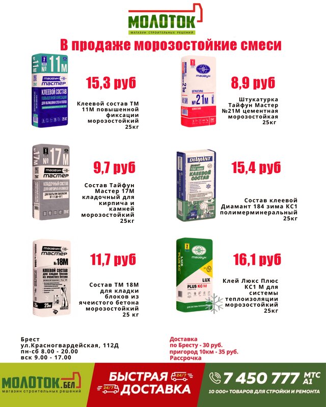 🔥 Успейте купить морозостойкие смеси по выгодным ценам! ❄️🏗 📦 СПИСОК ПОЗИЦИЙ: Клеевой состав ТМ 11М 25 кг — повышенная фиксация, морозос...