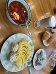 Всё неожиданно вкусно и недорого. Особенно понравился грибной суп, а также вареники с вишней - это вообще шедевр. Сочные, полные вишенок, фигурно залепленные, при варке не развалившиеся. Одним словом - вкуснота и красота. Хороший вид из окна.