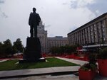Солидный памятник, еще и на фоне сталинки. Сейчас сама площадь украшена тематически. Всё это вместе очень атмосферно.