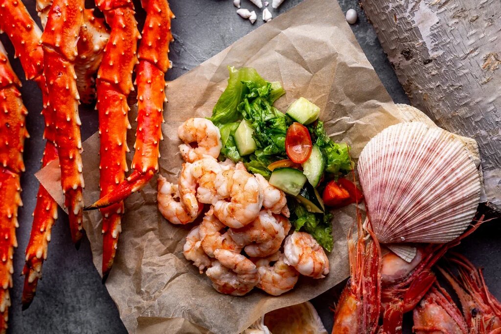 Seafood:octopuses, shrimp, oysters, scallop, sea cocktail, crab, squid, crayfish, mussels