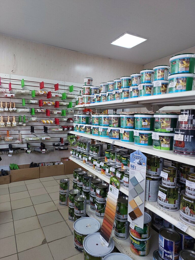 Большой выбор красок на любой вкус есть и расходники к краскам. Продавец всегда подскажет по вашему желанию. По ценам чуть дороже чем в городе,но и ехать ни куда не нужно!