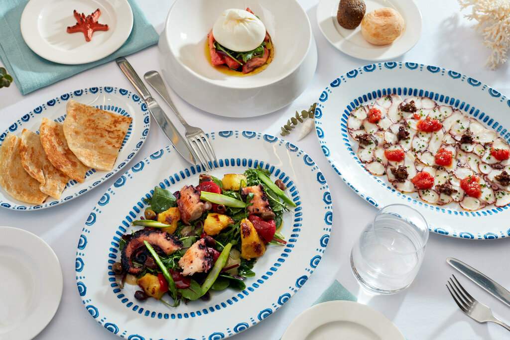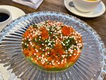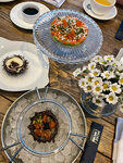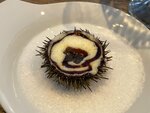 Отличная летняя веранда на крыше, внутренний зал ей проигрывает, хотя и там красиво. Я решила попробовать две позиции из морского ежа - свежий еж с тартаром из лангустина и запеченный еж с муссом из пармезана. Вторая мне понравилась больше, но вообще и там, и там дополнительных ингредиентов больше, чем самого ежа. Кутаб с крабом и страчателлой - начинки много, но было суховато, несмотря на то, что подается со сметаной. На десерт мы взяли шоколадный куб (просто шоколадное мороженое), жареную бриошь (соленая карамель имеет «домашний» сливочный привкус) и дубайский тирамису (вместо печенья савоярди - тесто катаифи в шоколадно-ореховом соусе).