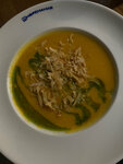 Состав: тыквенная база, креветка аргентинская, кокосовое молоко, зеленое масло, соус шрирача, тесто хворост