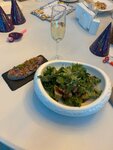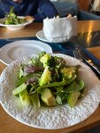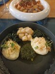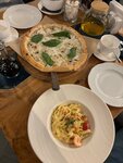 Пришли (двое взрослых и ребенок в коляске), спросили у официанта можно ли сесть на террасе, в ответ согласие. Усаживаемся за стол на четверых, прибегает хостес и говорит, что этот стол занят с 18:00 и мы можем остаться если успеем покушать до этого времени. Смотрю на часы там 17:30. На соседнем столе на четверых стоит табличка резерва, спрашиваю почему тут нет - только протерли не успели поставить. Садимся за стол для двоих. Ребёнку стульчика предложено не было. Пока мы там находились хостес провела трех мужчин за один из тех двух зарезервированых столов, со словами, что резерв на восемь вечера, и надо успеть уйти до этого времени. Мы ушли в 19:00 стол за который сели изначально так и стоял пустым. Оценку снижаю за это и за уставшие столовые приборы, выглядят очень потрепано. Цена несколько выше среднего. Если обычно без алкоголя мы едим на 3т.р., и это любые позиции в меню то тут 4т.р. и это средние и дешёвые позиции. Подача достаточно быстрая. Кухня вкусная) Вкусный гребешок с пюре из цветной капусты, вкусная пицца- и начинка и тесто. Суп куриный - средненький - мало мяса, неудобная паста, яйцо перепелиное, но одно.