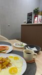 Понравилось кафе, чисто, светло, быстрое обслуживание. Кофе отличный, яичница по карельски за 270 руб для завтрака самое то)) блинчики (порция 2 штуки) вкусные. ВАЖНО: есть игровая зона для деток!