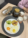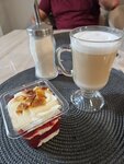Приятная атмосфера, отличный дизайн помещения -- глаз радуется и отдыхает. Прекрасная акустика -- никакого постороннего звона посуды и прочих левых звуков, фоновая музыка идеально подобрана по громкости и частотам, включая сочные басы, так, чтобы и радовать слух, и не заглушать разговор. Официантки культурные, приветливые, вежливые, да порции маленькие. И ценник --вполнетак ресторанный: неполный обед на двоих без алкоголя встал в 1.5К. Кулинарией -- не поражён, обычная качественная кафешная еда. Ещё не понравилось, что небольшенькие основные порции компенсируются огромными мегакалорийными кусками торта к кофе, а простой булочки с маком или традиционной калитки нет в принципе. Мне, как диабетику, это было ударом под дых. Мощный глюкозный удар, а через два часа опять голоден.