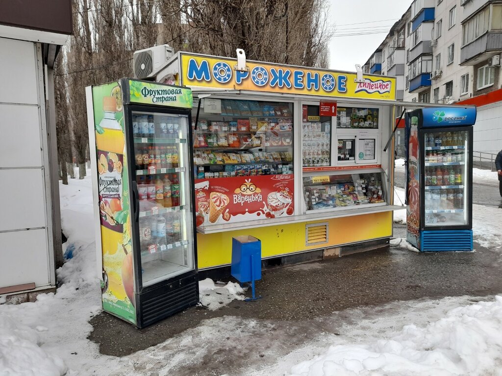 Киоск, как и на любом другом районе города, в продаже липецкое мороженное и прохладительные напитки, не понимаю, его надобности , рядом с продуктовым магазином, в котором выбор больше.