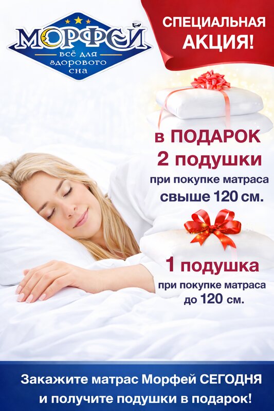 Уже второй раз заказываем матрас в "Морфее". Очень радуют адекватные цены и отличное качество товара. Брали матрас для папы, сделали скидку, как для пенсионера. Денис (хозяин) привез товар в оговоренный срок без задержек, по моей просьбе поднял матрас к квартире. В подарок к купленному матрасу еще получила новую подушку. Очень удивилась. Спасибо огромное за качество, сервис, оперативность и помощь в доставке.