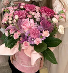 Роза пионовидная Эквадор 60 см - 10 Роза микс Эквадор 60 см - 7 Роза кустовая Кения 60 см - 10 Эвкалипт (банч) - 0,5 Фисташка (банч) - 0,5 Упаковка Лента