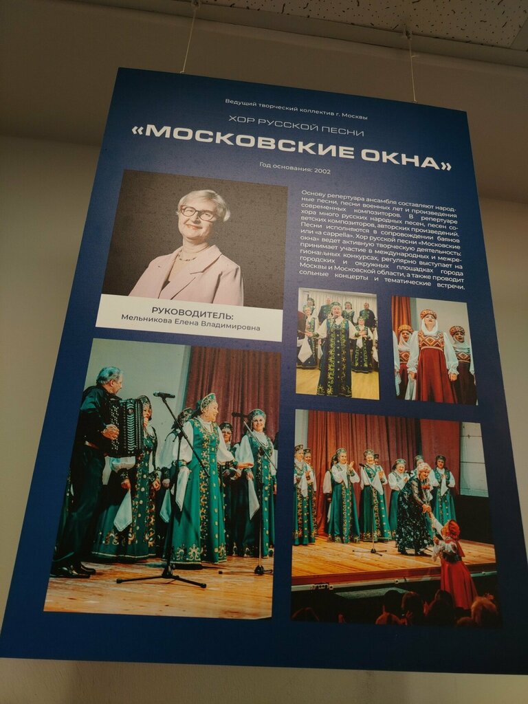 Дом культуры"Московские окна", очень хорошая клубная система. Много уделяется время ,подростающему поколению. Очень много разнообразных танцевальных кружков. Преподаватели все высокой квалификации. Доброе отношение обслуживающего персонала,администрации. Нашлось место и для нашего серебряного возраста. Замечательные два хора под руководством Мельниковой Е.В. Спасибо руководителям.