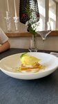 К сожалению меню оказалосл не разнообразным. Много блюд с трюфелями,грибами и рыбой, которые мы не едим. Из того что выбрали- три были в стоп листе. В итоге я взяла телятину под соусом из домашнего майонеза, тунца и каперсов- очень вкусно! Нежно и терпко. А вот сыну не повезло, картошку со сметаной и огурчиками, "бонусом" Украсили щучьей икрой.. А он аллергик и рыбу не ест. Официантка была вежлива но тороплива, сразу убежала, мы не успели ничего сказать. И после нас не спросили понравилось ли.. Также, было бы приятно, если перед тем как "продать" Бутылку воды за 300р, скажут о том что она платная🤣водички попили почти на 600 р.