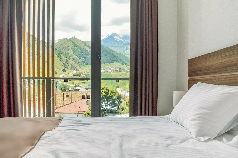 Nice hotel. There is a small parking lot near the hotel for 2-3 cars. There is a terrace with stunning mountain views on the 4th floor. The church and Kazbek are visible. The rooms are of good size. Large bathroom. There are personal hygiene products. Towels and bed linen are in good condition. Comfortable beds. There is no air conditioner or refrigerator. Breakfast is meager. The coffee is natural.