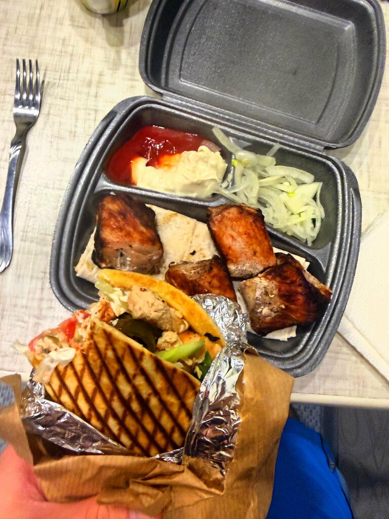Купили шаурму на пополам, чисто на пробу, тк первый раз тут были, разрезали по просьбе, добавили чуть больше соуса, все отлично. По вкусно очень даже, но местами суховата, но эта шаурма вернула меня в момент, когда впервые попробовал, точно такой же вкус был!! Спасибо за воспоминания))