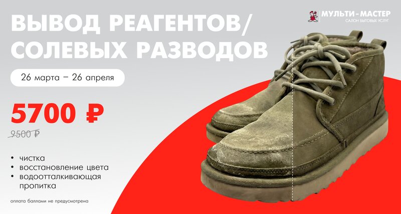 Фиксированная цена — качественно, аккуратно и быстро. В МУЛЬТИ-МАСТЕР выполняем экспресс-химчистку кроссовок, эффективно удаляя загрязнения и запахи. Восстанавливаем свежесть и аккуратный внешний вид обуви.