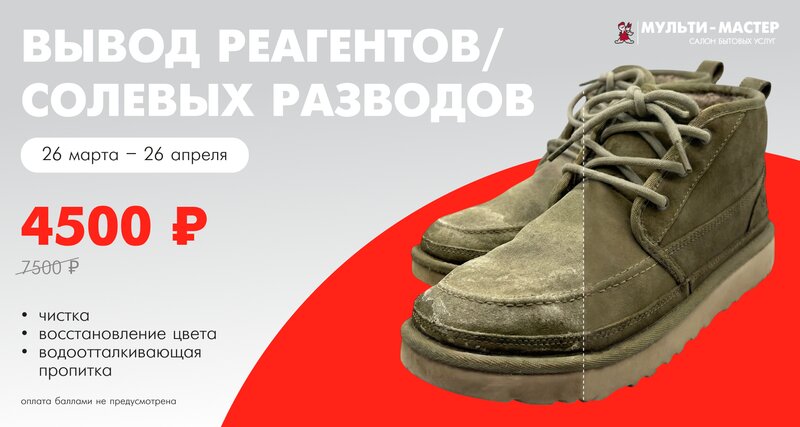 Фиксированная цена — качественно, аккуратно и быстро. В МУЛЬТИ-МАСТЕР выполняем экспресс-химчистку кроссовок, эффективно удаляя загрязнения и запахи. Восстанавливаем свежесть и аккуратный внешний вид обуви.