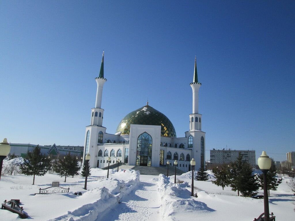 Единственная мечеть мусульман в Кемерово. Построена в удачном месте- тихий спальный район среди новостроек и нового проспекта, но в тоже время обособленно, в стороне от дороги. Территория поражает своей ухоженностью, чистотой и умиротворённостью. На рассвете при восходе солнца выглядит как турецкий пейзаж из окна отеля🔥 Мечеть 3-этажная, выполнена в трех стилях-арабском, самаркандском и турецком , в здании даже есть лифт. Невероятно красиво внутри, для нас очень необычно, ощущение, что ты находишься где-то в арабской стране Есть возможность посетить с экскурсией, персонал приветливый.