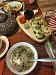 Не вкусно. Я обычно не пишу отзывы. Но здесь захотелось. Заказали салат чука. Принесли салат чука с водорослями и сказали в меню опечатка. На замечание- предложили убрать из счета его. Мы отказались, тк чуку хотелось очень, потом принесли роллы, которые в меню вообще не такие, они оказались зелеными. Мы не стали возмущаться, ну думаем бывает, красная икра наверно закончилась. Но когда принесли запеченные мидии - просто отвратительные, уже не сдержалась. Сказала- как эту субстанцию можно вообще есть. Ответ- мидии у нас готовые покупаются, замороженные. Тададам. Место прям столовая на троечку. Точно не стоит 5600 на троих. Коктейль был по вкусу не май тай. Но вкусный. Из плюсов- кальмар в кляре норм и картошка фри. Стрипсы пережаренные. Жаль что повара убивают бизнес …