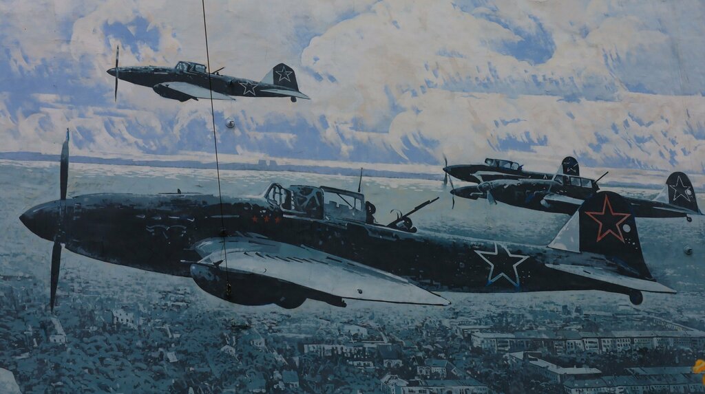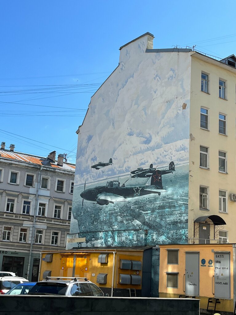 Доходный дом И. С. Семенова Но примечателен, не сам дом, а мурал на стене здания. Военные самолеты на голубом небе, как на картина на холсте известного художника.