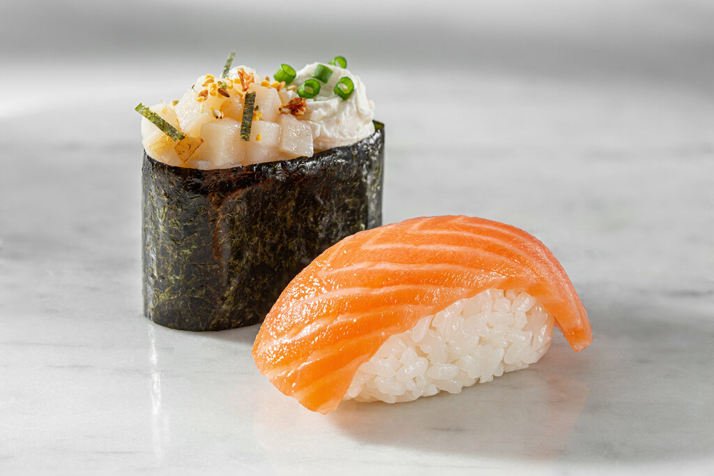 Краб микс, сыр сливочный, соус белый, кунжут белый, рис, нори, сыр твёрдый, лосось копчёный, такуан