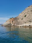Мы подплывали к мысу с моря со стороны посёлка Рыбачье. Выглядит очень живописно - массивные скалы уходят прямо в воду. За мысом есть дикий пляж. В этом месте классно нырять с масками - множество рыбок, огромные валуны, гроты и ущелья. Сверху мыса есть тропа, но она очень крутая, в одном месте приходится карабкаться по верёвке