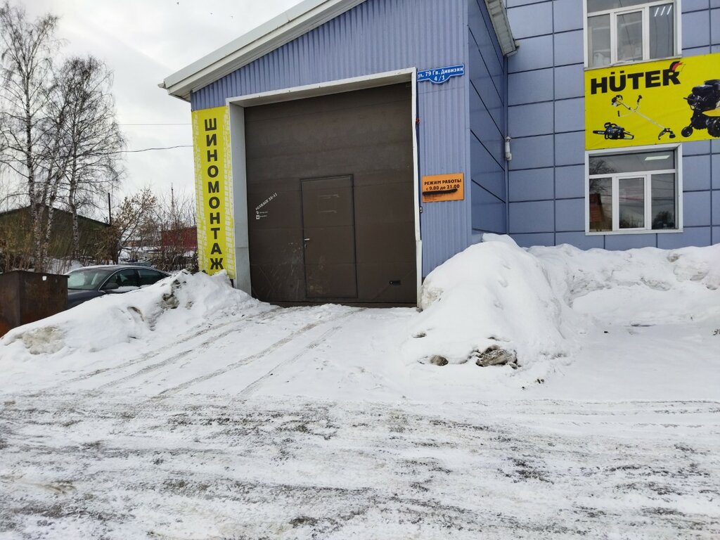 Tomsk, 79-oy Gvardeyskoy Divizii Street, 4/1 • слева от сверху написано Шиномонтаж, магазин Электрон-М