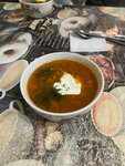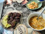 Очень вкусно, свежее. Первое с утра приготовленное, второе готовили при нас, пока мы ели первое.Печень пожарили как-то по особенному, с поджаристой корочкой. Отбивная тонкая, мягкая, присыпана чесночком. Порции большие, что не осилили, взяли с собой. Хозяйка была одна, и мы сначала тоже были одни. Если будет много людей, возможно, придется немного подождать, но оно того стоит. А так отличное место, рекомендую. Спасибо.