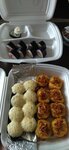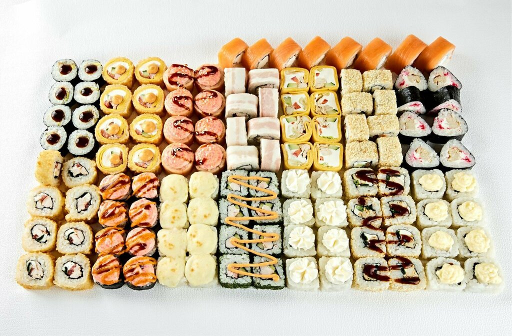 Variety of food:sushi and rolls, pizza, сhinese food, burgers