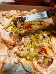 Пришли компанией 6 человек. Взяли все по шаурме ( разные) Салат недельный везде, воняет кислятиной протухшей. Салат айсберг на фото. Не рыбы не мясо внутри( две шаурмы на фото )