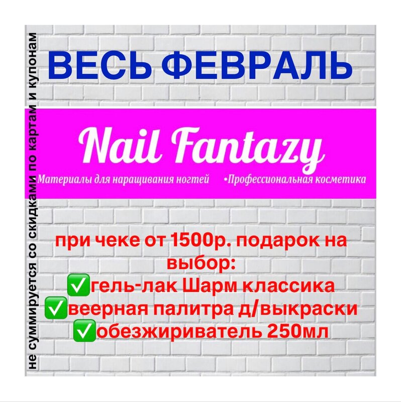 🎯ВЕСЬ ФЕВРАЛЬ🎯 При сумме чека от 1500₽ выбирай подарок: ✅гель-лак Шарм классика ✅веерная палитра для выкраски (50типсов + кольцо) ✅обезжир...