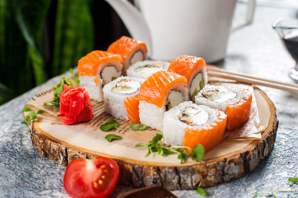 1. Фреш 8шт (рис, нори, авокадо, огурец, сыт сливочный, кунжут, Унаги) 2. Филадельфия Лайт 8шт ( рис, нори, сыр сливочный, лосось) 3. Спайси краб 8шт( рис, нори, огурец, снежный краб, соус спайси, масаго) 4.Курасахи 8шт ( рис, нори, курица, огурец...