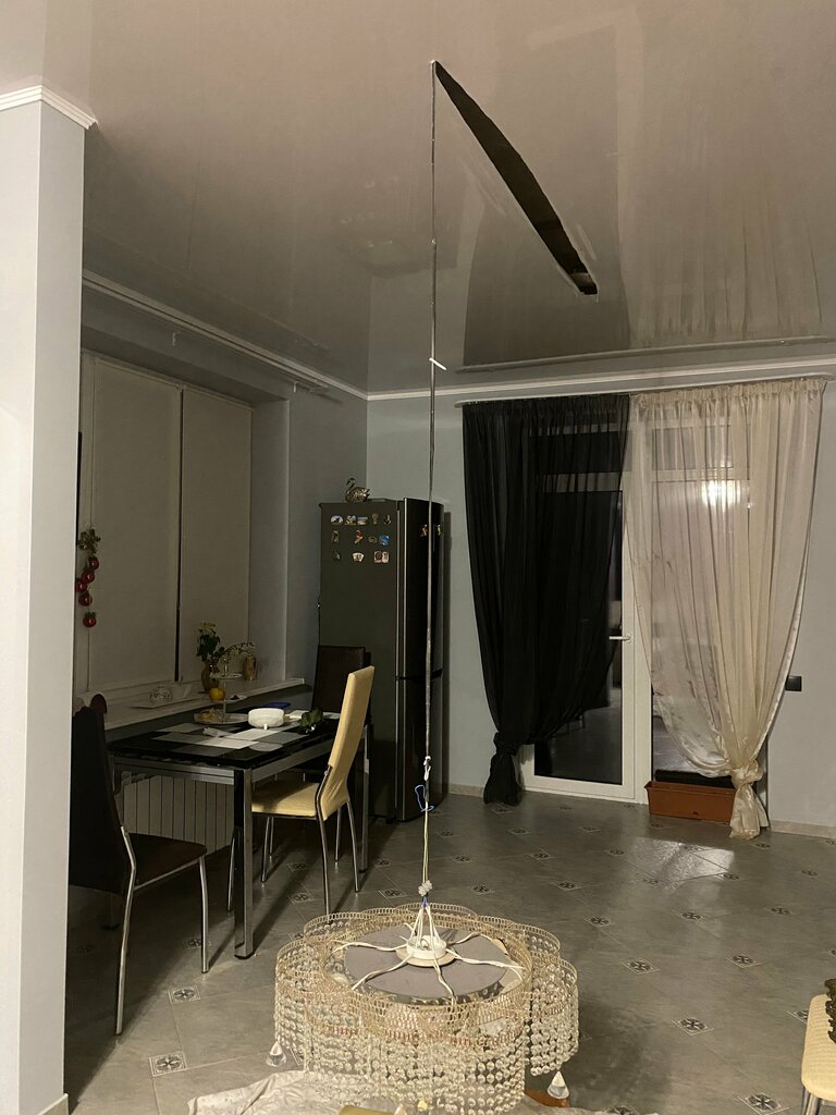 Кошмарным утром 03.05.2023 г. я обнаружила, что порывалось полотно и большая хрустальная потолочная люстра в кухне-столовой рухнула, а именно висит на э/проводе почти касаясь пола – на расстоянии 26 см от пола. Уведомила по телефону менеджера и приехала с претензией по адресу Сиверса 23. Сняли люстру с э/провода и пообещал,что завтра-послезавтра приедут заменять полотно!В этом же помещении весит вторая аналогичная люстра которую перекосило!—Ноль эмоций!на звонки не отвечают-сбрасывают!Из некачественного материала производят материалы и не торопятся исправлять свои ошибки!
