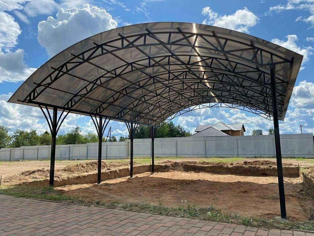 Каркас: профильная труба 40×40×2 мм (стойки), 30×30×2 мм (арки). Покрытие: сотовый поликарбонат 8–10 мм (UV-защита). Высота: 2,2–2,5 м. Ширина: 3–6 м (на 1–2 машины). Длина: 4–8 м. Фундамент: металлические столбы с бетонированием или винтовые сваи.
