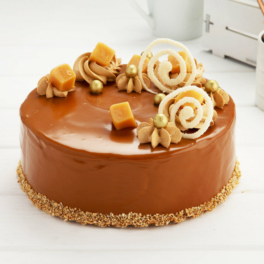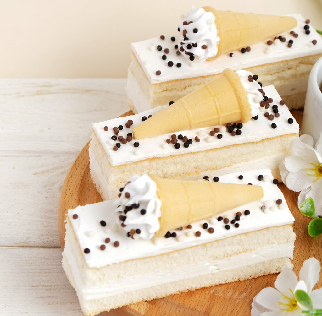 Пирожное состоит из двух слоев бисквита: шоколадного и классического белого, пропитанных ванильным сиропом в сочетании со сметанным кремом. Оформлено пирожное шоколадным желе, темной и белой крошкой и коктейльной вишенкой.