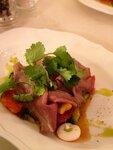 Салат сочетает нежные татаки из тунца с картофелем конфи, томатами и перепелиными яйцами, обогащённый свежестью горошка и пикантностью оливок. Медово-горчичный соус придаёт всей композиции сладковатый и острый акцент