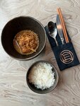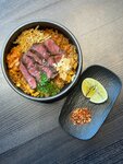 Жареный рис с овощами, сочной вырезкой из говядины и пикантной капустой кимчи