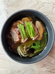 «Неони» - «не они», «другие», а другие, потому что паназиатская кухня. Потому что другая гастрономическая цивилизация. По-другому в Азии не только готовят, подают и едят, по-другому выстраивают собственную философию, основанную на традициях. Именно поэтому у «Неони» есть «хранитель» в доспехах самурая Ёрои выполненных в стиле Окегава До, эпоха Эдо Япония (период между 1603 и 1867 годами) и настоящий меч катана - Рюдзин «Бог дракон» покровитель водной стихии, выполненный кузнецом Кунитада в период Хэйсэй. Безусловно, лучших символов национального кода, эстетики и энергетики, понятных даже юным гостям ресторана, не найти! Итак, что в тарелке? Ролл Креветка, имбирный дрессинг 990₽ В разрезе - мечта перфекциониста (креветка, сливочно-соевый сыр, маринованная японская редька дайкон, шпинат, нори, рис), сверху ролл покрывают отварной креветкой и поливают имбирным дрессингом. Красиво, вкусно, пикантно, свежо и ярко! Я не великий знаток паназиатской кухни, ем часто, готовлю крайне редко. Поэтому выражу своё впечатление/мнение в баллах. Дрессинг - соус или заправка. 5/5 Рис с курицей 690₽ Отварной рис жасмин обжаривается с овощами (сладкий перец, лук репчатый, морковь, цукини), добавляется креветочный соевый соус, тушится. Блюдо сервируется обжаренной курицей Робата, дополняется термальным яйцом, приготовленным методом сувид (40 минут 60 градусов), посыпается яйцо золой из лука-порея, кунжутом и луком сибулет, подаётся со смесью перцев Шишито Тогораши (молдонская соль, хлопья чили, кунжут белый и черный) и долькой обожженного лайма.  Можно заказывать детям или людям с проблемами ЖКТ, ибо остроты нет. Курице не хватило характера и хрустящей корочки, но если закрыть глаза на удовольствие и выбрать пользу, то это 5/5. Робата -японский гриль. Рис с говядиной 890₽ Всё как с рисом с курицей, только яйцо добавляется при обжарке, т.е. яйцо будет замешано с рисом. Дополняется блюдо вырезкой из говядины, обжаренной на гриле до обжарки medium well, при отдаче говядина посыпается молдонской солью, рядом выкладывают лук-порей фри, лук сибулет, капусту кимчи, чипсы из риса.  5/5 Лосось вараяки, грибной даси 1900₽ Рыбу готовят традиционным способом - обжаривают на огне на опалённом сене, добавляют грибной бер-блан даси (симбиоз французского эмульгированного масляного соуса бер-блан и традиционного японского даси), грибы шиитаке. Подают под стружкой тунца, грибными чипсами эноки и с паровым рисом.  Блюдо шикарное! Аромат, не побоюсь этого слова, копчёной щепы, стружки тунца, рыбы и очень вкусный соус: бульон даси (стружка тунца, соевый соус, водоросли комбу), вино белое, сливки, масло сливочное, грибы белые. Получила от блюда незапланированное удовольствие! 5/5 Рамен с пекинской уткой 690₽ Насыщенный утиный бульон, капуста пак-чой, лапша пшеничная промышленная Саппоро, утка по-пекински, японский омлет томаго. Рамен украшают луком сибулет. Утку готовят 4 дня, весь процесс описывать не буду, скажу только, что все те вкусы и ароматы, которые впитала в себя утка (лемонграсс, лук-порей, чеснок, чили, сельдерей, молотый имбирь, молотая корица, соус хойсин, соус чу хоу, соус чар сиу…) украсили и обогатили блюдо. Я люблю, когда корица заявляет о себе чуть ярче остальных пряностей и специй, сегодня было как я люблю.  Утку обязательно приду есть как самостоятельное блюдо. Вкусно! 5/5 Клубничный моти 590₽ Нач