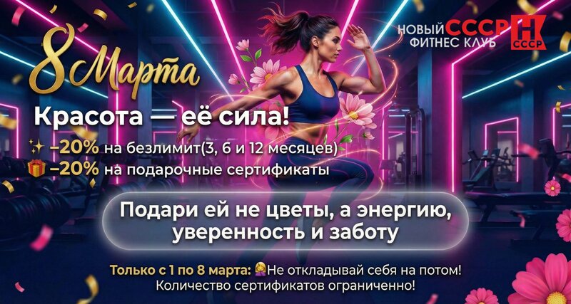 🌸 8 Марта в NEW CCCP 🌸 Красота — её сила! Только с 1 по 8 марта: ✨ –20% на безлимит в тренажерный зал (3, 6 и 12 месяцев) Лёгкость, эне...