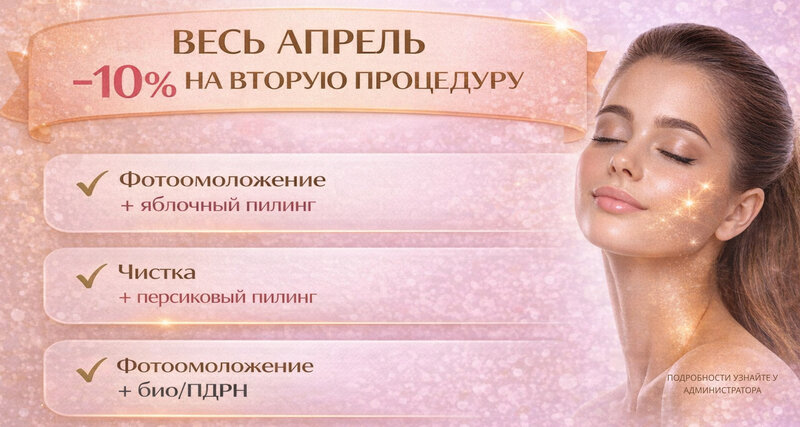 Весь апрель в клинике "New Way" скидка на вторую процедуру: 1. Фотоомоложение+ скидка 10% на яблочный пилинг 2. Фотоомоложение+ скидка 10% н...