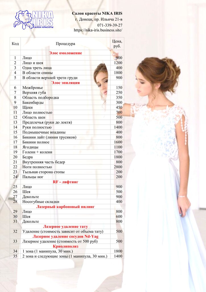 Cosmetology services:arsonvalization, biorevitalization, biolifting, noninjection mezotherapy, anti-age procedures, mezotherapy, acne treatment, photorejuvenation, lifting, hardware cosmetology, facial, cosmetic tattoo, peeling, body care, removal vascular defects, cleansing, epilation, collagen, fractional resurfacing, phonophoresis, non surgical skin lifting, figure correction, facial massage, laser rejuvenation