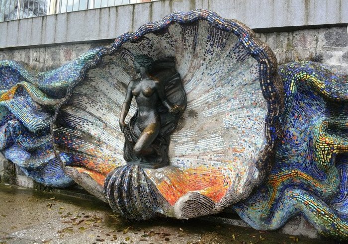 Вот это да (возглас зрелого Мужчины!): - бронзовая скульптура ["Создана Г. Брахертом в 1938 году. Моделью стала семнадцатилетняя Кете Циган"] "с обнажённым бюстом под названием “Нимфа” на фоне мозаичной раковины" в славном граде Светлогорск! Для Человека разумного "Легко угадывается, какие части тела по мнению туристов, приносят удачу".