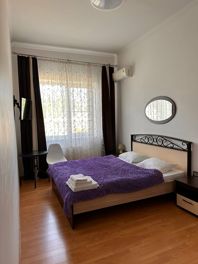 Хорошая и уютная гостиница. Жили 2 дня в номере ном.5 на втором этаже с выходом окон во внутренний дворик. Утром просыпались по пение петухов из соседнего двора. В 50 метрах от гостиницы городская администрация и парк с фонтаном. Напротив гостиницы караоке-бар. В 200 метрах, за администрацией, магазин Пятерочка. Недалеко есть большой Магнит Семейный. Номер на 3+1 человека имеет 3 кровати односпальных в одной комнате и диван в другой. В номере есть санузел с раковиной, душевой кабиной и унитазом. Большой шкаф для одежды. Во входной комнате комод и телевизор. Небольшой круглый столик и два пуфика. От других постояльцев узнали что нам повезло, на 3 этаже номера без санузла. Он общий на этаж. Завтраки включены. Мы попали на два завтрака. Первый день людей было много и был шведский стол: яичница с беконом, нарезка огурцов, каша, сосиски в тесте, тосты. На следующий день все разьехались и на завтрак нам принесли (причем точно по времени, как договаривались) яичницу с беконом, тосты, сосиску, покетированный кофе 3 в 1. Завтракают на 3 этаже, там выделеная зона со столами. Есть бойлер с кипятком, электрочайник, посуда и раковина. В целом очень приятная атмосфера, несмотря на мелкие недочёты вроде немного разболтанных замков и дверных ручек, матрасов с выпирающими пружинами. На шум из окон не жалуемся - по соседству еще одна гостиница и строится что-то. На 2 этаже есть балкончик где можно посидеть. Приветливая хозяйка. По гостинице гуляет замечательная ласковая кошка. У гостиницы есть парковка во дворе по крайней мере на 6 машин, не считая 2 машин хозяев гостиницы.