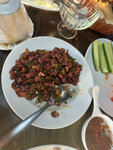 Обжаренная печень, сердце говядины с овощами