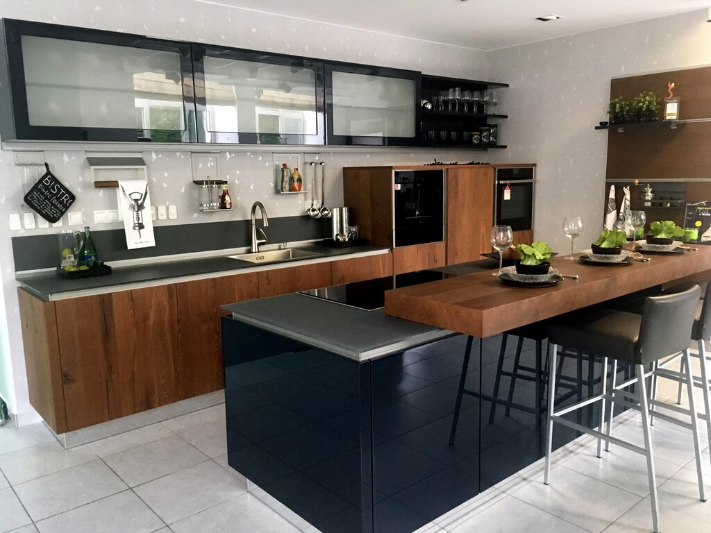 Кухня Nolte Kuechen модель NEO SLATE с островом и встраиваемой бытовой техникой, мойкой и смесителем.