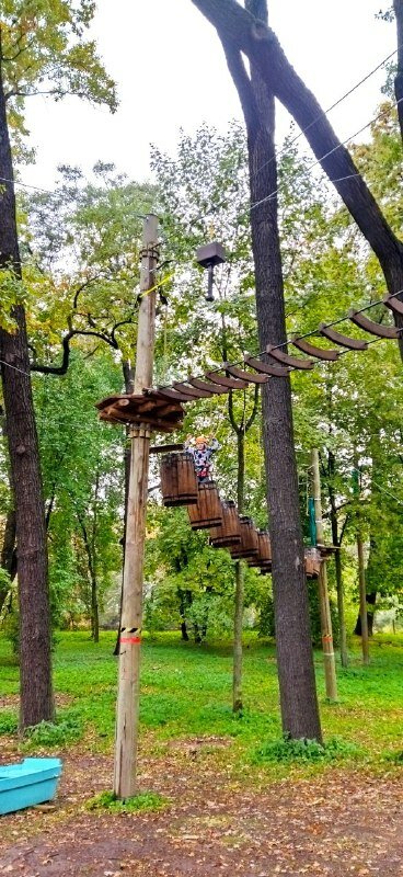 Сегодня посетил этот прекрасный веревочный парк. Впечатлений - выше крыши. Со стороны кажется не очень большим в плане территории, но как только Вы начинаете проходить трассу, время вокруг замирает. Остаётесь только Вы и трасса. Всего здесь 4 трассы и одна тренировочная. Две зеленые - это для новичков, а две синих - для продвинутых участников. И ни в коем случае не стоит их недооценивать. Трассы весьма большие и две синие по-настоящему бросают вызов Вам и Вашей выносливости. Бояться здесь нечего: перед выходом на трассу Вас проинструктируют и заставят пройти тренировочную трассу под пристальным контролем, чтобы убедиться в усвоении Вами инструктажа. Очень вежливый и отзывчивый персонал, который готов помочь в случае возникновения каких-то затруднений. Этот парк идеально подходит для получения незабываемого опыта и симпатии к горному туризму.