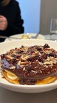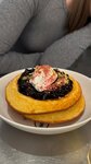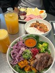 Взяли с подругой по боулу на обед. У меня был с цыплёнком: очень понравился, супер сытно, вкусно, все ингредиенты в блюде ощущаются. Хочется так же отметить соус - божественный. У подруги был боул с креветкой - вкусом тоже осталась довольна, единственное - некоторые листы шпината были дырявые, будто их до неё жевали гусеницы :( В качестве напитка я заказала смузи Dragon Ball - состав очень заинтересовал, в итоге как-то кроме банана я ничего не почувствовала… подруга отметила то же самое. Она заказала себе чайник персикового улуна- немножко не поняли эту позицию: из персикового был только цвет, может так и должно быть? И отдельным мини разочарованием для нас стали хоткейки с шоколадным соусом. Сами по себе они вкусные, тесто - кайф, нежное, но плотненькое, сытное, хлопья морской соли тоже приятно вписываются - на мой вкус. Почему соус называется шоколадно-кофейным не поняли, ощутили только вкус горького шоколада. И самым ужасным было то, что блюдо «украсили»(?) горькими грецкими(?) орехами (на пекан они не были похожи совсем), они прямо имели вкус лежавшего горького старья, ужас. Я вкус как-то перебила, убрала все орехи и доела без них. А подруга в итоге не осилила свою половину…