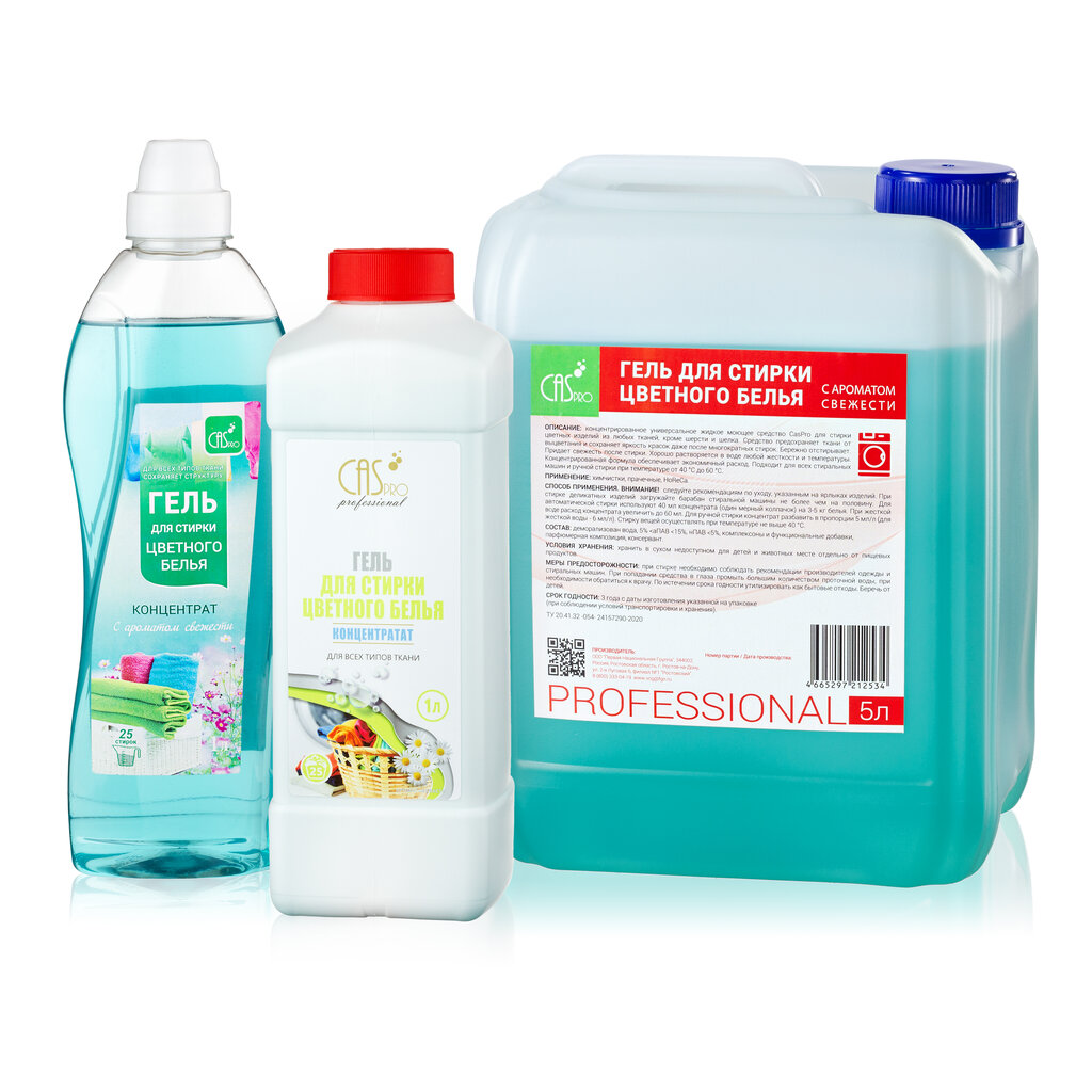 Гель для стирки цветного белья C ароматом свежести Описание: Концентрированное универсальное жидкое моющее средство CasPro для стирки цветных изделий из любых тканей, кроме шерсти и шелка. Средство предохраняет ткани от выцветания и сохраняет ярко...